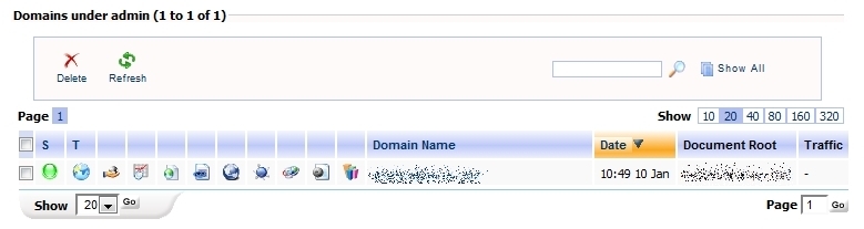 Após o Kloxo efetuar o cadastramento do domínio ele voltará para a mesma tela. Rolando ela até o final você poderá ver o seu domínio criado, conforme mostra a figura abaixo.